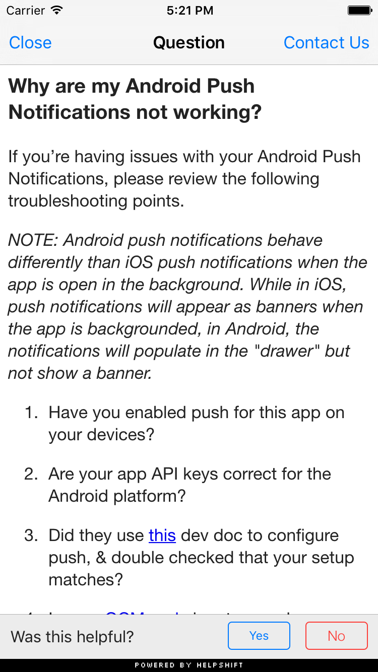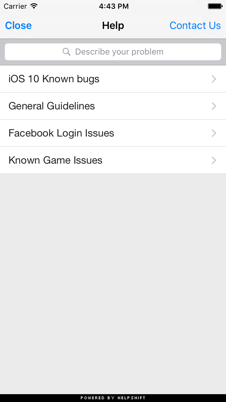You can use the showFAQs api call to provide a way for the user to invoke the purpose built help/support section in your app. This is the easiest approach to enable help in your app as it bundles all the capabilities of the Helpshift SDK in a simple and intuitive interface. You can wire this api call to a "Help" or "Support" action in your app. This Activity combines the FAQ, Search and Contact Us functionality together in a single interface. In this view a user has to search for a specific question in the FAQ failing which they can report an issue. When you respond back to their question from the Helpshift Agent Dashboard, the reply will be shown as a count besides Contact Us, clicking on which will open up the conversation.